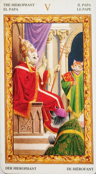 *권위주의와 강압적인 규범: 교황카드는 권위와 규범을 상징하기도 합니다. 이 카드의 부정적인 해석은 강압적인 규범과 권위주의적인 태도를 의미할 수 있습니다. 다른 사람들로부터의 간섭이나 제약을 느낄 수 있으며, 자유로운 의사결정과 개인의 신념을 힘들게 할 수 있습니다.