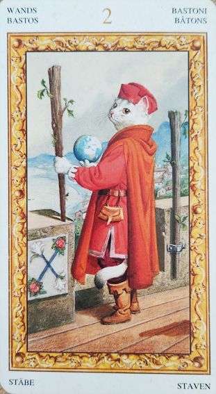 2 완즈는 한 사람이 서서 한 손에 지구본을 들고 다른 손에 지팡이를 들고 있는 모습으로 그려집니다. 이는 이 사람이 현재의 위치에서 멀리서 미래를 내다보며 계획을 세우고 있는 것을 나타냅니다. 또한 성에 걸려 있는 지팡이는 이미 자신이 이룬 것을 나타내며 거기에 만족하지 않고 개인적인 성장과 진전을 향해 나아가는 의지를 상징하며 2 완즈는 당신이 현재의 상황을 넘어서며, 더 큰 성공과 충족감을 위해 대안을 모색하고자 하는 욕구를 나타냅니다. 이는 자신의 비전과 목표를 깊이 생각하고 계획을 세워야 함을 알려 줍니다. 2 완즈는 미래에 대한 가능성을 열어놓은 상태이지만, 이를 실현하기 위해서는 결정과 행동이 필요합니다.