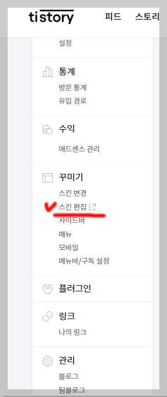 5. 문제의 티스토리 블로그로 이동하여 관리자 모드에서 <꾸미기>에서 <스킨편집> 클릭합니다.