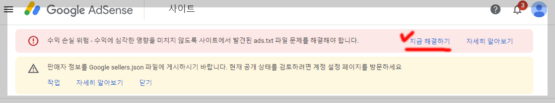 1. 수익 손실 위험 - 수익에 심각한 영향을 미치지 않도록 사이트에서 발견된 ads.txt 파일 문제를 해결해야 합니다.--> 옆에 보시면 <지금 해결하기> 클릭합니다.