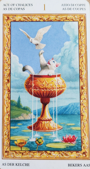 에이스 컵 카드는 일반적으로 한 손에 큰 잔이 들려있는 사람이 그려져 있습니다. 잔 안에는 물이 가득 차 있거나 꽃이 피어있을 수도 있습니다. 이는 행복하고 만족스러운 감정을 상징하는 것으로 해석됩니다. 에이스 컵은 이러한 긍정적인 감정과 축복을 나타내며, 더 나은 상황이나 새로운 기회를 제공한다는 의미를 내포합니다. 에이스 컵은 사랑과 관계에 대한 새로운 시작을 나타낼 수도 있습니다. 이 카드는 호감, 로맨스, 연애, 결혼 등의 긍정적인 사랑 관련 이벤트를 의미합니다. 또한, 창의적인 역량과 상상력이 높아진다는 메시지를 전달할 수도 있으며, 새로운 아이디어, 예술적인 영감, 창조적인 프로젝트의 개시를 나타낼 수 있습니다.