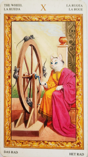 운명의 수레바퀴"는 타로 카드 10번 카드입니다. 이 카드는 일반적으로 "운명의 바퀴" 또는 "운명의 인형극"이라고도 불립니다. 이 카드는 주로 전환, 운명의 흐름, 운이 변화되는 시기를 나타내는 카드로 해석됩니다. 운명의 수레바퀴 카드에서 중요한 이미지는 수레바퀴입니다. 수레바퀴는 운명의 흐름과 인생의 순환을 상징합니다. 바퀴는 계속해서 돌고, 삶의 변화와 전환을 나타냅니다. 또한 수레바퀴는 운명의 핵심을 통제하고 이끄는 힘을 상징하기도 합니다